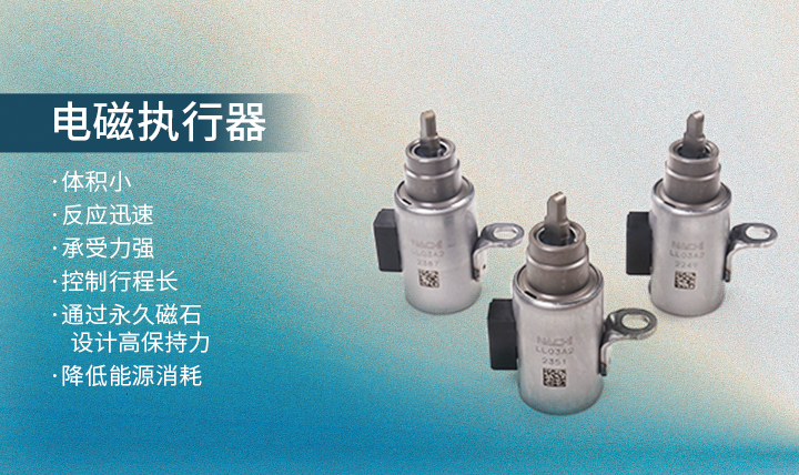 【用途】對應(yīng)汽車的電動化課題,通過電磁執(zhí)行器來實現(xiàn)由手動到電動的變化如自動駐車、電子換擋、離合器控制等 【特點】體積小、反應(yīng)迅速、承受力強、控制行程長、通過永久磁石設(shè)計高保持力降低能源消耗 【應(yīng)用實績】愛信8AT自動駐車采用量產(chǎn)中應(yīng)多加客戶要求面向CVT、AT、PHEV等各種規(guī)格開發(fā)試驗中。